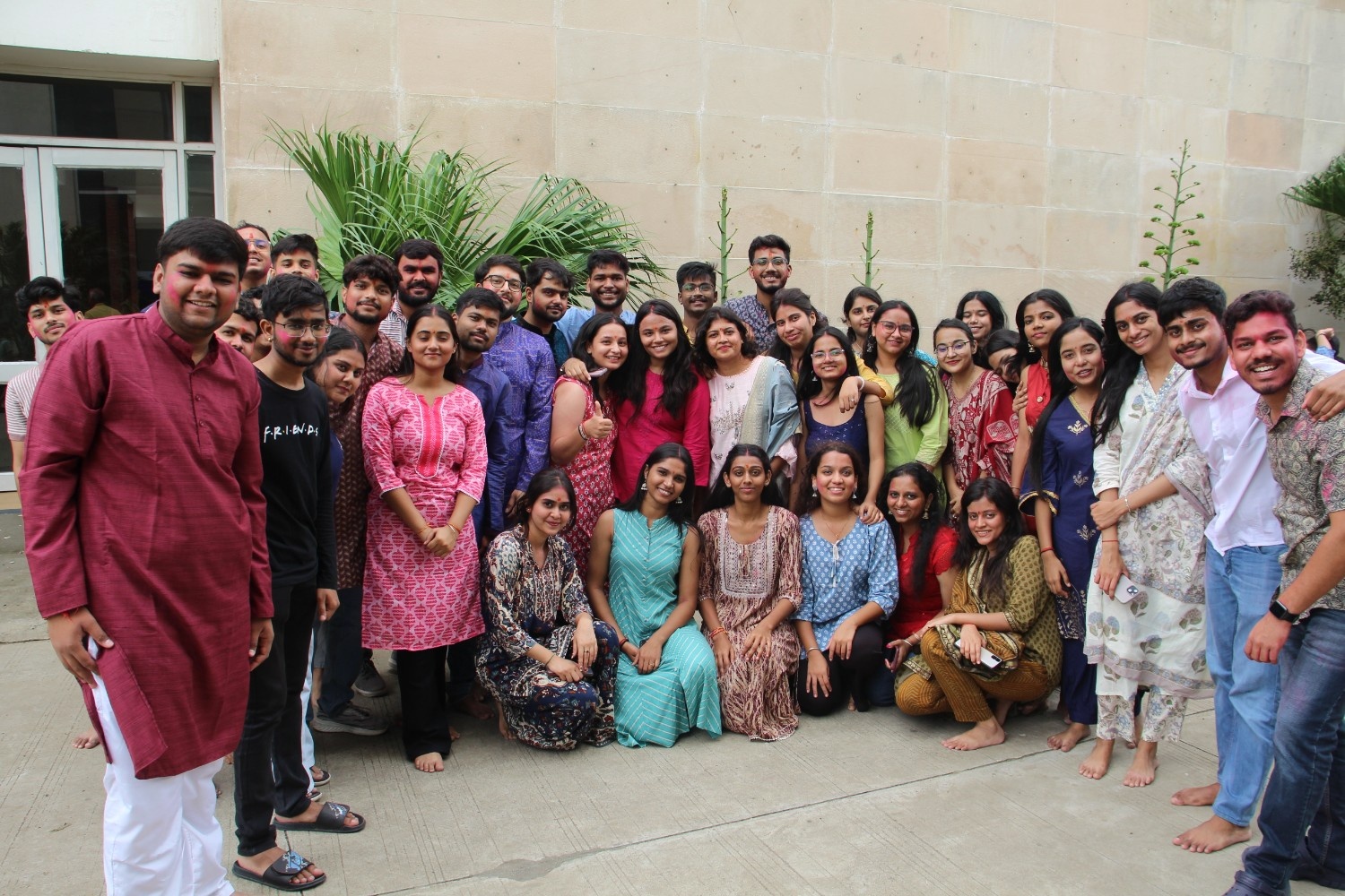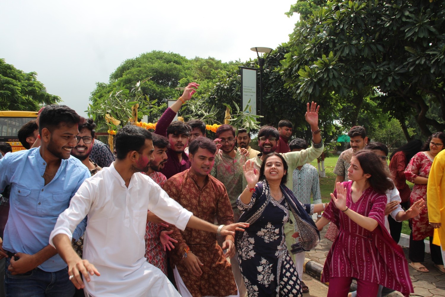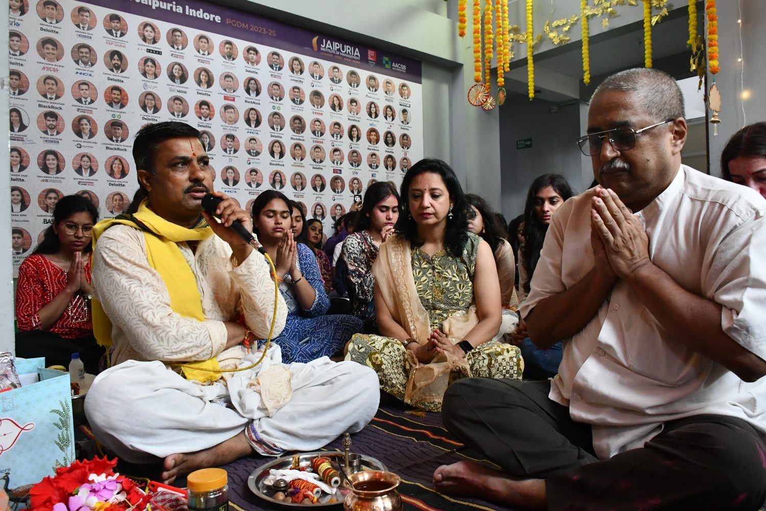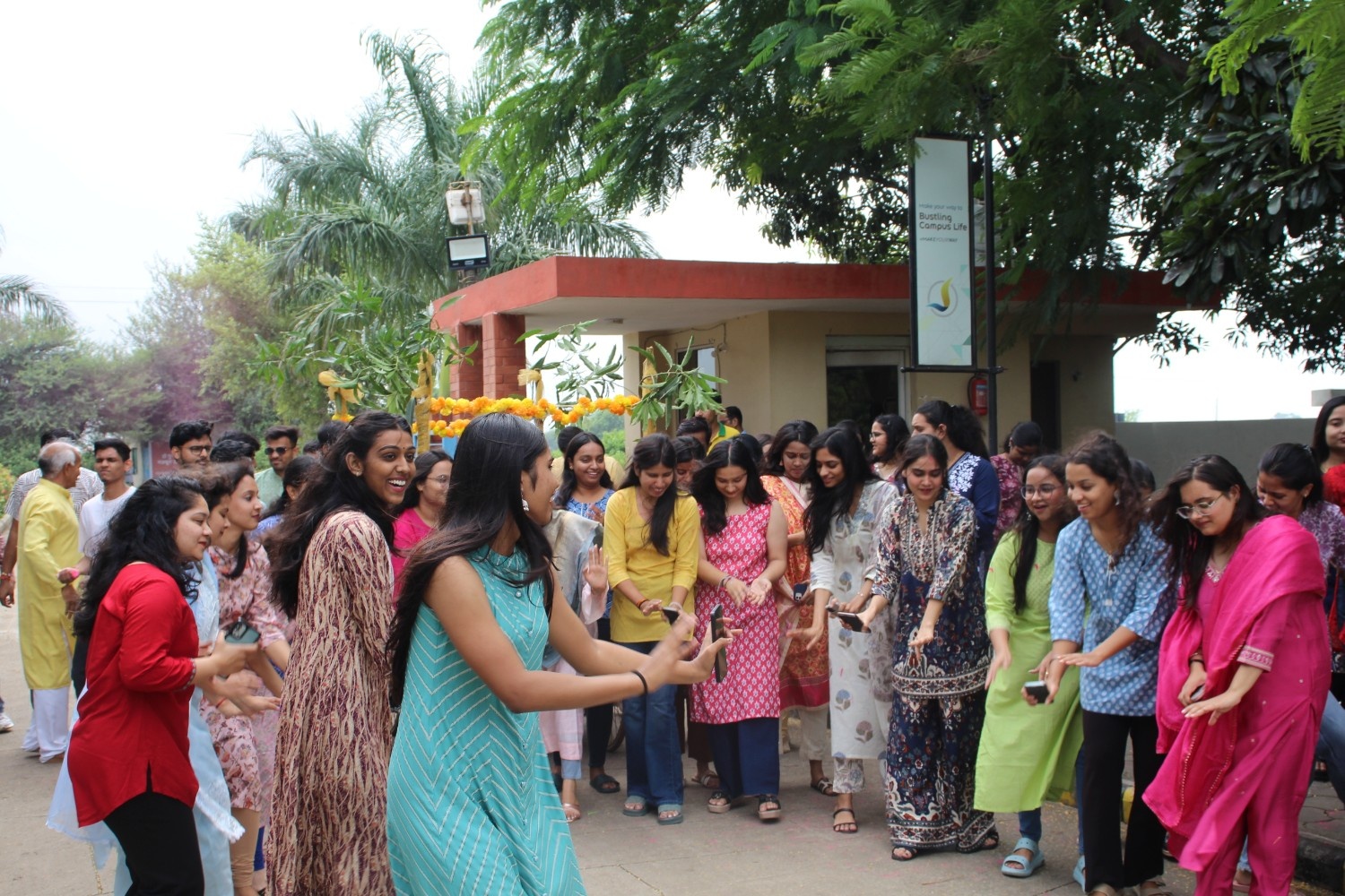 On 27 August, 2025, the Cultural & Creativity Committee came alive with devotion and festive spirit as it welcomed Lord Ganesha for this year’s Ganesh Chaturthi at Jaipuria Institute of Management, Indore. The grand arrival procession was a vibrant sight, with a beautifully decorated cart carrying Bappa, showered with flowers and gulal, accompanied by the lively beats of the dhol. Students, faculty, and staff all joined in with joy and enthusiasm, filling the campus with energy, togetherness, and reverence.