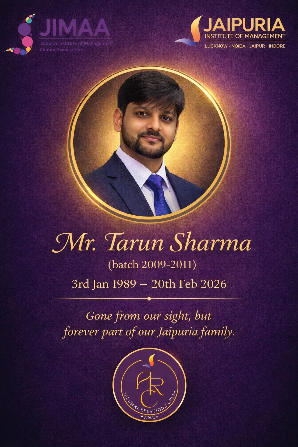 It is with deep sorrow that we share the untimely passing of Mr. Tarun Sharma, a valued member of the Jaipuria family and an alumnus of the PGDM-FS, Batch (2009–2011).
