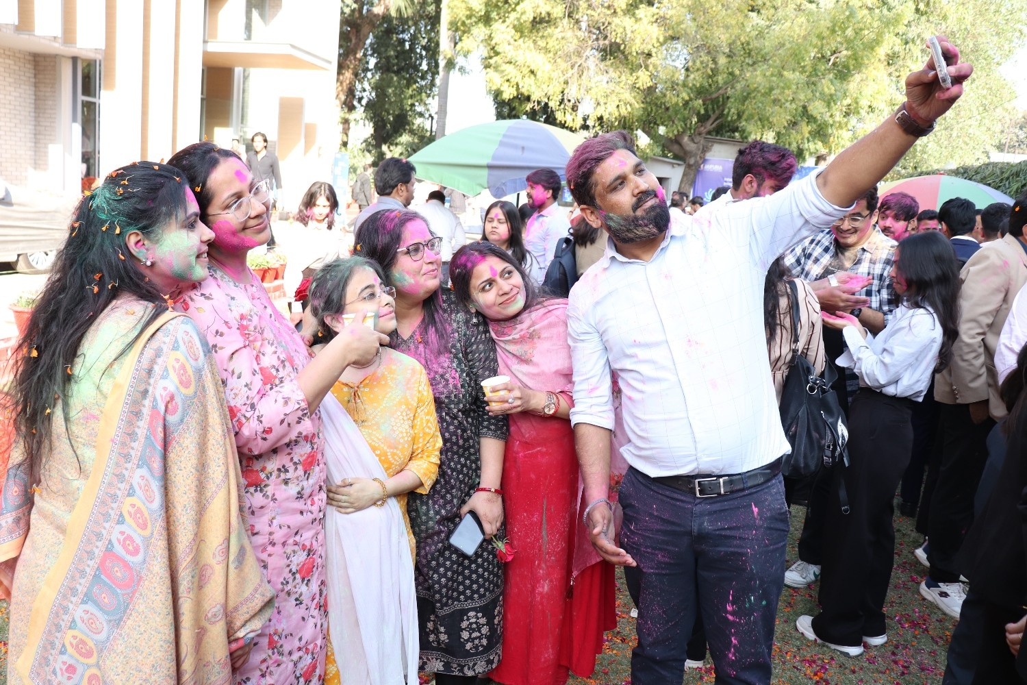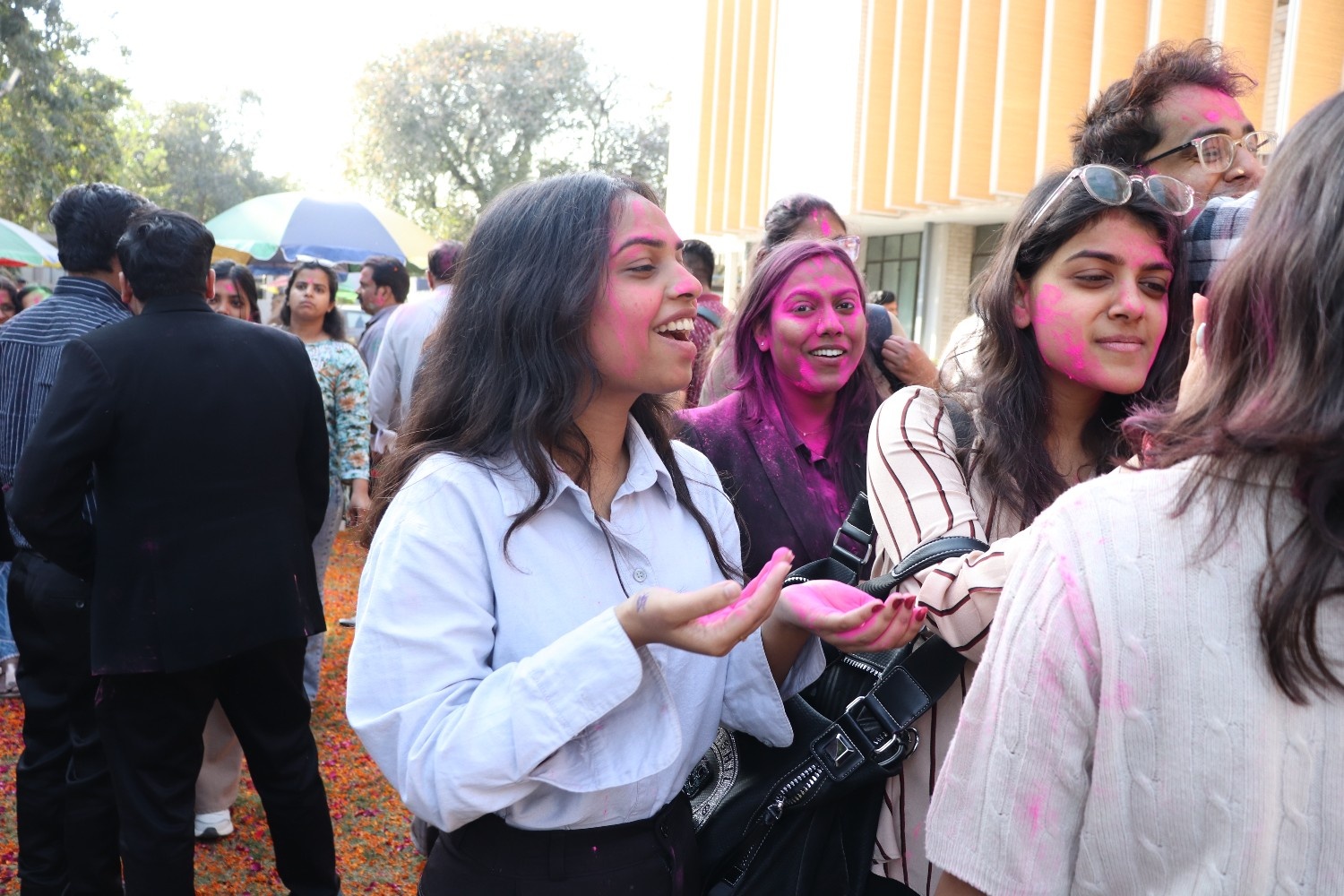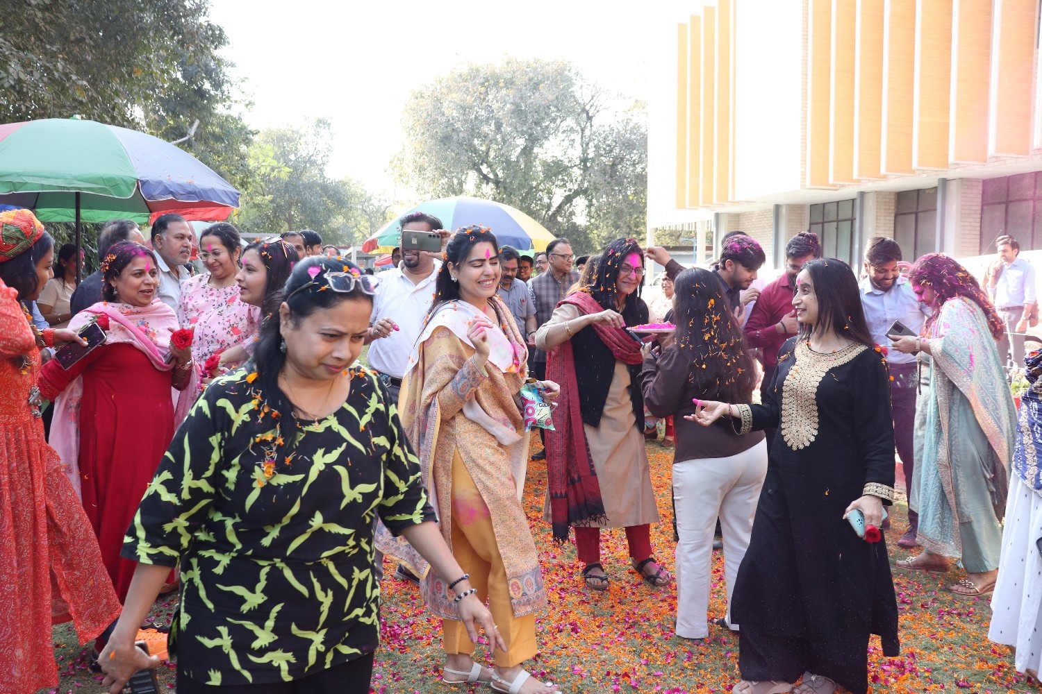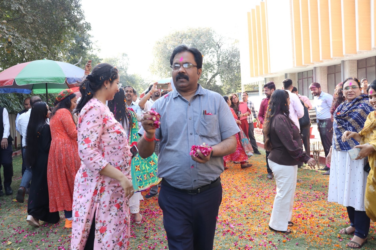The Director, faculty members, staff, students and support staff came together not in formal roles, but as one community. The lawns, usually echoing with academic discussions and deadlines, were instead filled with cheerful greetings, playful splashes of gulal and showers of flower petals. Pink palms waved at cameras, marigold petals floated through the air, and smiles carried more color than the brightest abeer.