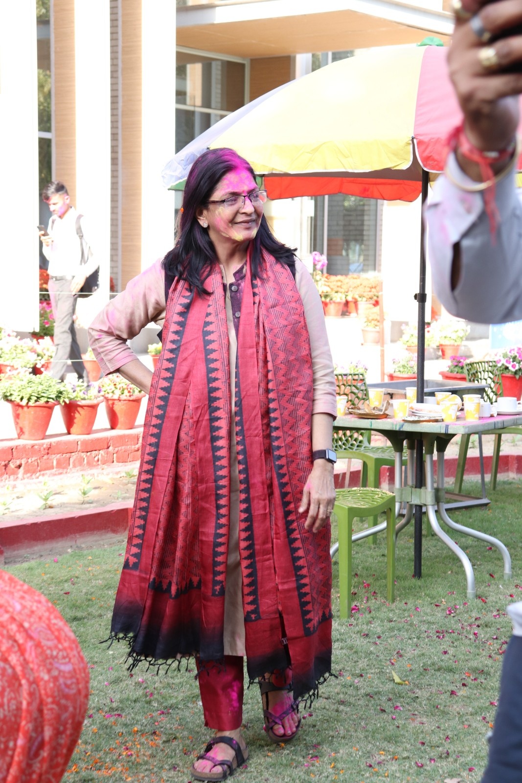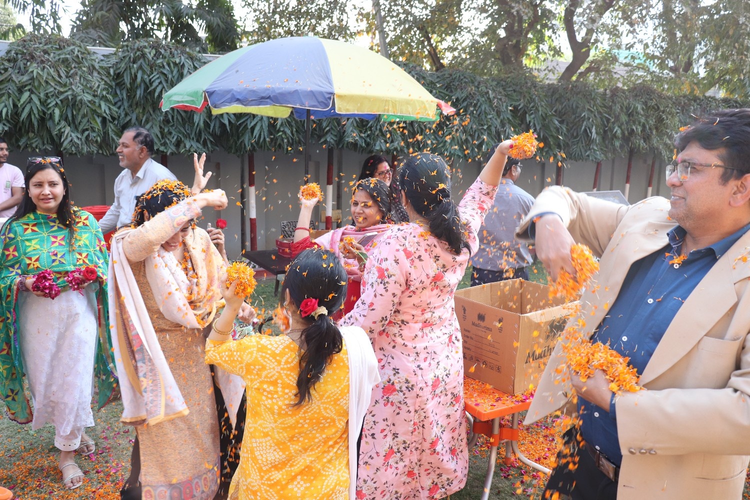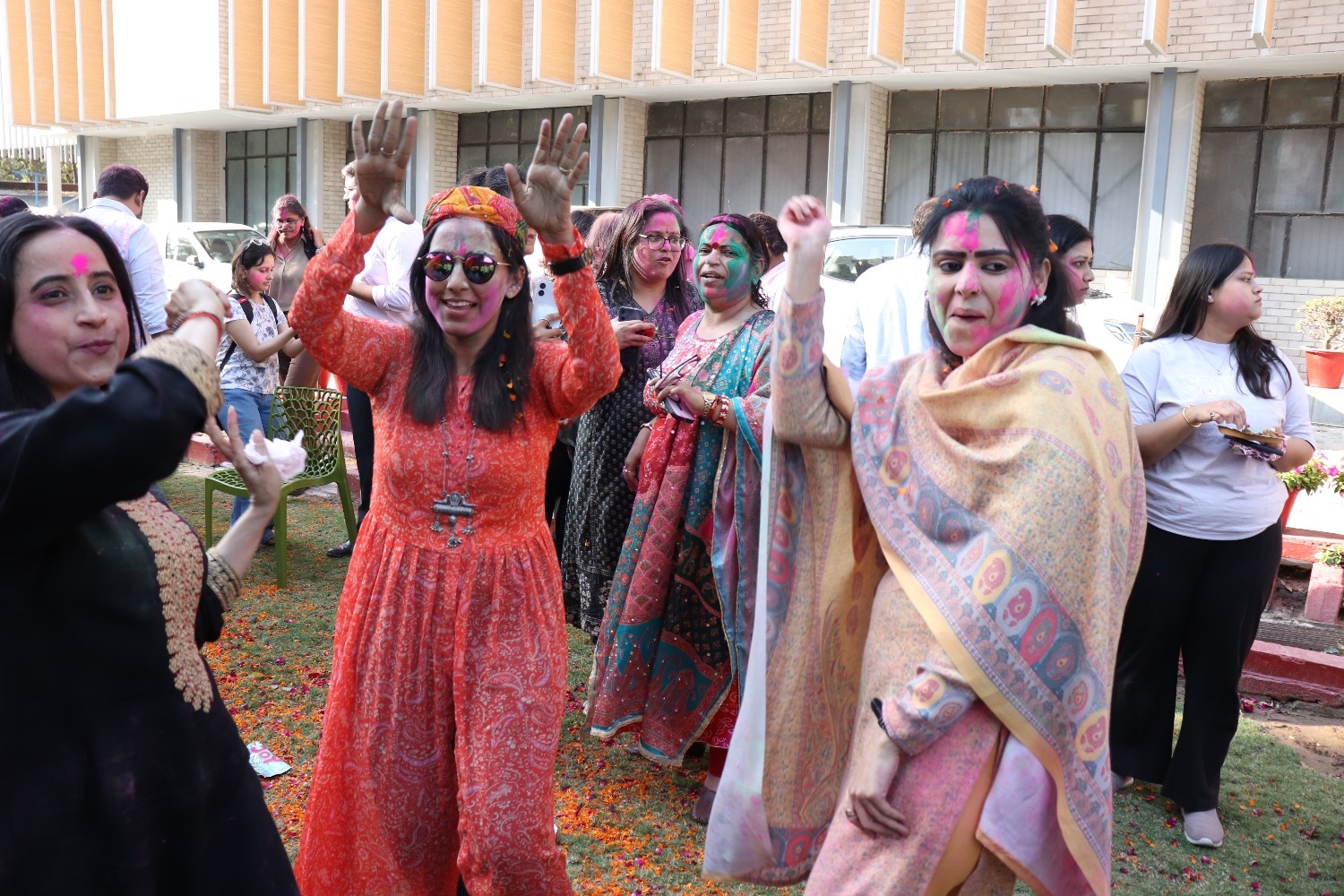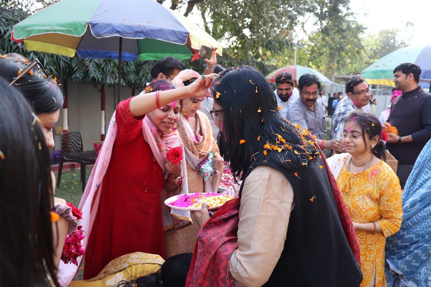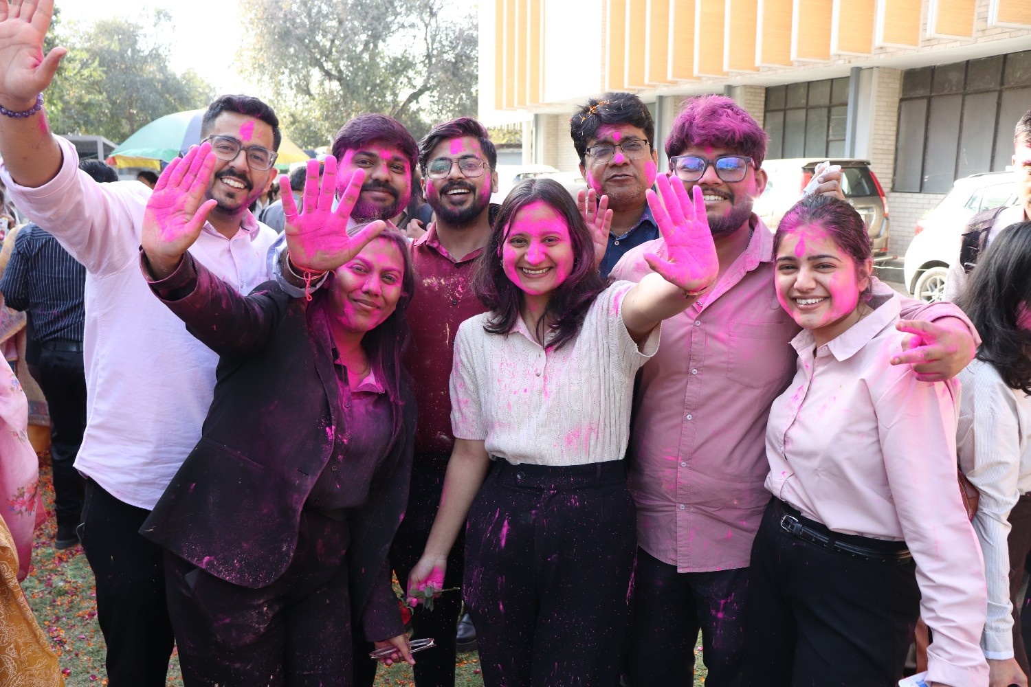 The Director, faculty members, staff, students and support staff came together not in formal roles, but as one community. The lawns, usually echoing with academic discussions and deadlines, were instead filled with cheerful greetings, playful splashes of gulal and showers of flower petals. Pink palms waved at cameras, marigold petals floated through the air, and smiles carried more color than the brightest abeer.