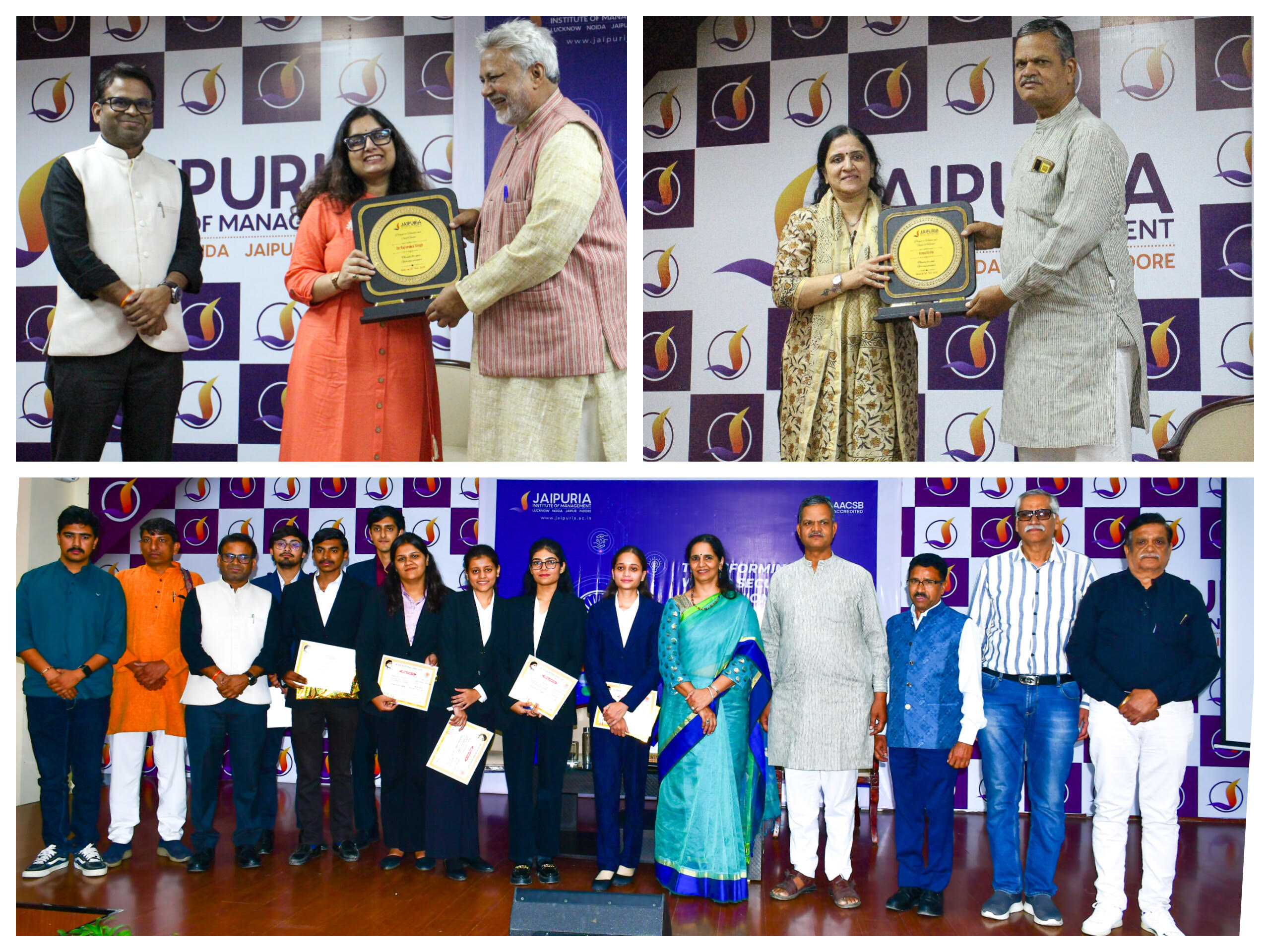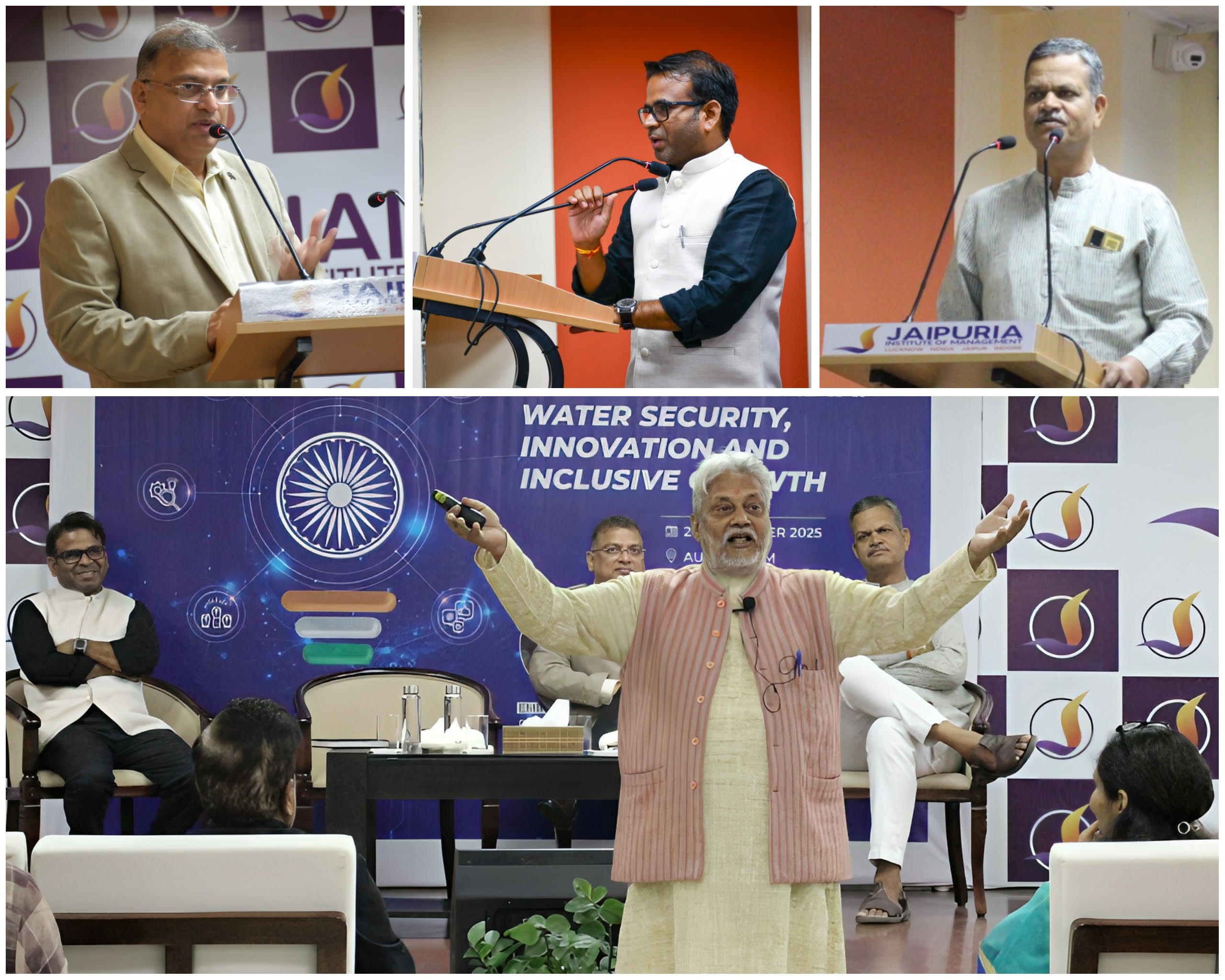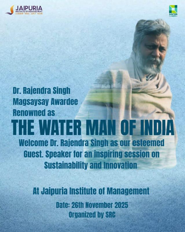 On 26th November, Jaipuria Institute of Management, Indore, hosted a high-impact conclave on “Transforming India through Water Security, Innovation, and Inclusive Growth.” The event brought together eminent social leaders and entrepreneurs who encouraged students to contribute actively to sustainable development and nation-building. The conclave featured Chief Guest, Dr. Rajendra Singh, the renowned Waterman of India and Ramon Magsaysay Awardee, along with distinguished speakers Mr. Manish Anand, Founder & CEO of Mithila Naturals, and Mr. Vinod Birla, Joint Secretary, Seva Bharti Malwa, who shared valuable insights that inspired students to adopt innovative, responsible, and community-driven approaches toward shaping a sustainable future.