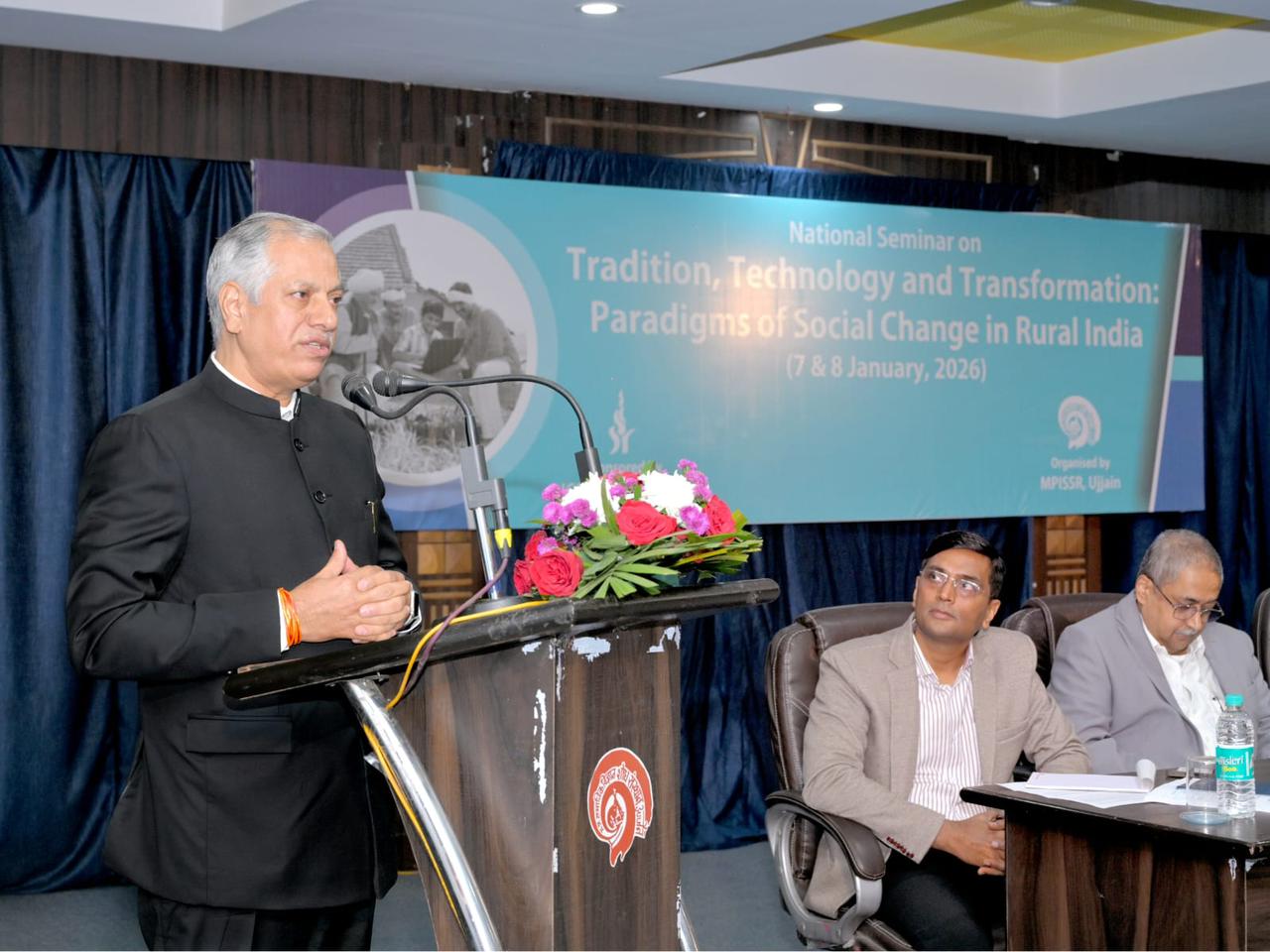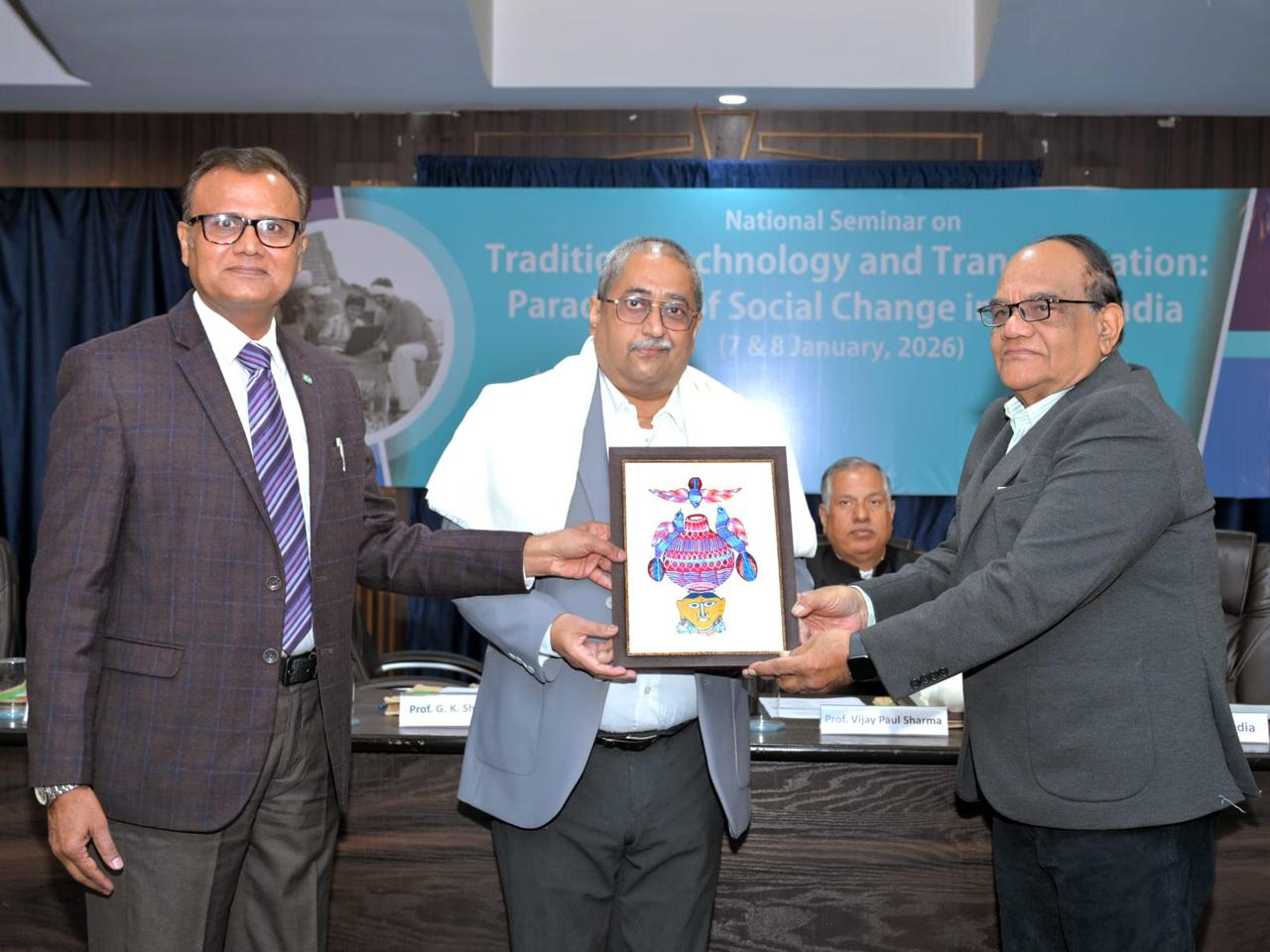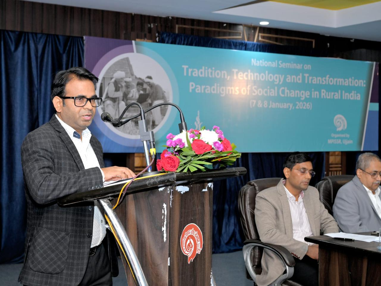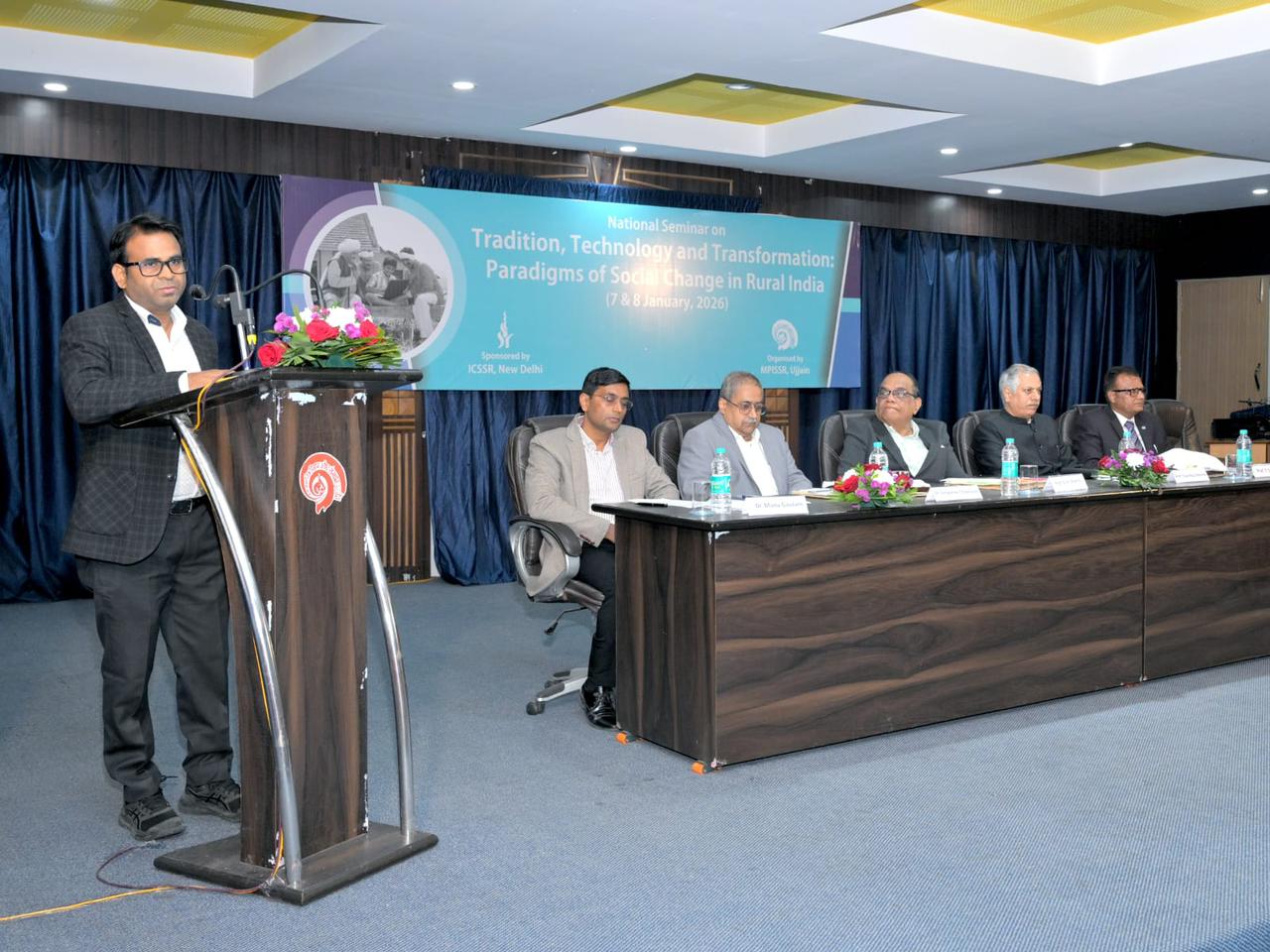 On 7–8 January 2026, Jaipuria Institute of Management, Indore campus, in collaboration with the Madhya Pradesh Institute of Social Science Research (MPISSR), Ujjain, successfully organised a two-day National Seminar on “Tradition, Technology and Transformation: Paradigms of Social Change in Rural India”, sponsored by the Indian Council of Social Science Research (ICSSR), New Delhi. The seminar featured distinguished participation from Professor Vijay Paul Sharma, Chairman, Commission for Agricultural Costs and Prices (CACP), New Delhi (Chief Guest); Dr. Deepankar Chakrabarti, Director, Jaipuria Institute of Management, Indore (Guest of Honour); Professor Gopal Krishna Sharma, President, MPISSR, Ujjain; Professor Yatindra Singh Sisodia, Director, MPISSR; Dr. Ghanshyam Pandey, Co-Convener of the seminar; Professor C. S. C. Sekhar (Panel Chair); Professor Ganesh Kawadia, former Head, School of Economics, Devi Ahilya Vishwavidyalaya; Dr. S. S. Kalamkar, Sardar Patel University, Anand, Gujarat; and Dr. Amarnath Tripathi, Jaipuria Institute of Management, Noida.