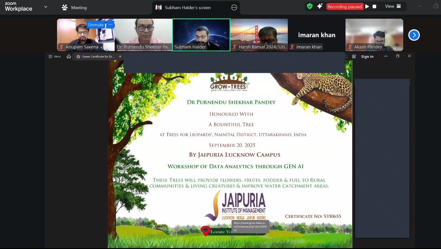On 20th September, 2025 from 4:00 pm to 5:00 pm Alumni Relation Cell, Lucknow organized a virtual session on Data Analytics and Artificial Intelligence conducted by Dr. Purnendu Shekhar Pandey, Associate Professor, Business Analytics at Jaipuria Institute of Management, Lucknow. The workshop aimed at introducing participants to the concepts of Artificial Intelligence (AI), Large Language Models (LLMs), and practical applications of Google Colab in data analytics. The session was though primarily organized for alumni, but a significant number of current PGDM students also attended the insightful session.